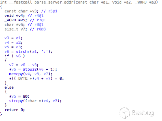 此處代碼明顯存在溢出,首先memcpy函數在使用時指定的拷貝長度只與源字符串有關,其次在另個分支中直接使用了危險函數strcpy。兩處拷貝的目標緩沖區v4,即傳入parse_server_addr的第二個參數,實際是在上層函數中棧上的局部buffer,因此這里的溢出是典型的棧溢出。