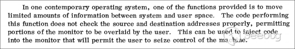 棧溢出攻擊的相關概念最早要追述到1972年美國空軍發表的一份研究報告《Computer Security Technology Planning Study》。在這份報告中,通過溢出緩沖區來注入代碼這一想法首次被提了出來。大家來感受一下最早的描述原文: