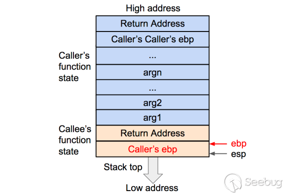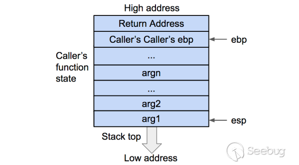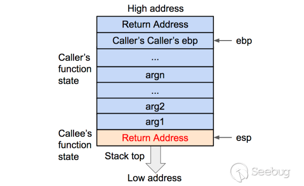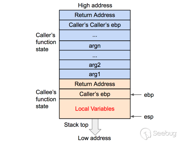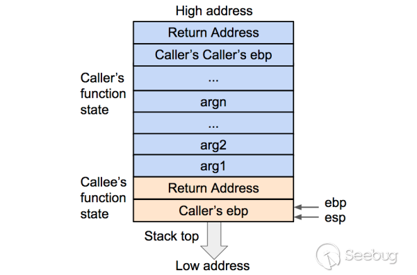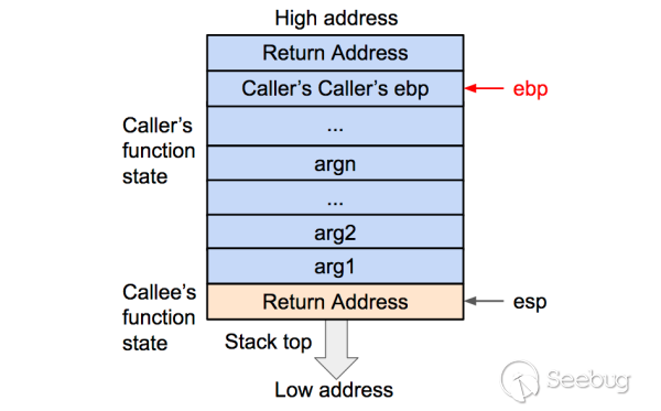 在壓棧的過程中,esp 寄存器的值不斷減小(對應于棧從內存高地址向低地址生長)。壓入棧內的數據包括調用參數、返回地址、調用函數的基地址,以及局部變量,其中調用參數以外的數據共同構成了被調用函數(callee)的狀態。在發生調用時,程序還會將被調用函數(callee)的指令地址存到 eip 寄存器內,這樣程序就可以依次執行被調用函數的指令了。