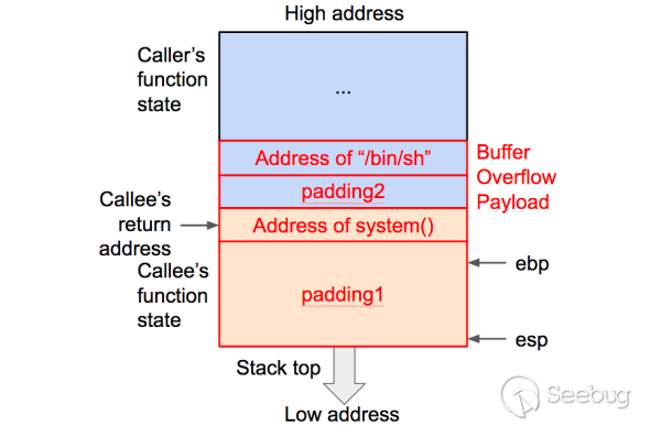 修改返回地址,讓其指向內存中已有的某個函數(return2libc)