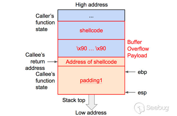 我們可以在調試工具里查看返回地址的位置(可以查看 ebp 的內容然后再加4(32位機),參見前面關于函數狀態的解釋),可是在調試工具里的這個地址和正常運行時并不一致,這是運行時環境變量等因素有所不同造成的。所以這種情況下我們只能得到大致但不確切的 shellcode 起始地址,解決辦法是在 padding2 里填充若干長度的 “\x90”。這個機器碼對應的指令是 NOP (No Operation),也就是告訴 CPU 什么也不做,然后跳到下一條指令。有了這一段 NOP 的填充,只要返回地址能夠命中這一段中的任意位置,都可以無副作用地跳轉到 shellcode 的起始處,所以這種方法被稱為 NOP Sled(中文含義是“滑雪橇”)。這樣我們就可以通過增加 NOP 填充來配合試驗 shellcode 起始地址。