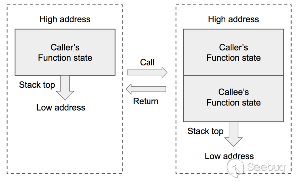 函數調用棧是指程序運行時內存一段連續的區域,用來保存函數運行時的狀態信息,包括函數參數與局部變量等。稱之為“棧”是因為發生函數調用時,調用函數(caller)的狀態被保存在棧內,被調用函數(callee)的狀態被壓入調用棧的棧頂;在函數調用結束時,棧頂的函數(callee)狀態被彈出,棧頂恢復到調用函數(caller)的狀態。函數調用棧在內存中從高地址向低地址生長,所以棧頂對應的內存地址在壓棧時變小,退棧時變大。