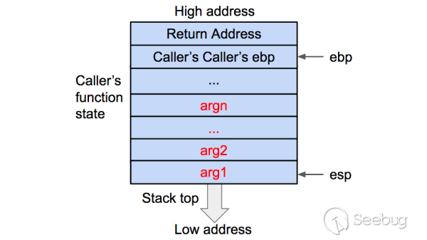 首先將被調用函數(callee)的參數按照逆序依次壓入棧內。如果被調用函數(callee)不需要參數,則沒有這一步驟。這些參數仍會保存在調用函數(caller)的函數狀態內,之后壓入棧內的數據都會作為被調用函數(callee)的函數狀態來保存。