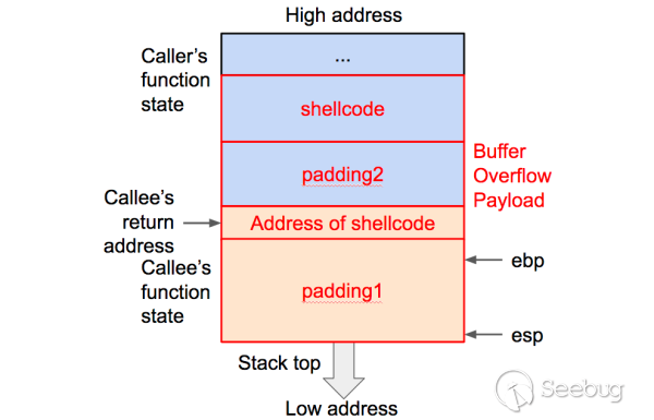 介紹完背景知識,就可以繼續回歸棧溢出攻擊的主題了。當函數正在執行內部指令的過程中我們無法拿到程序的控制權,只有在發生函數調用或者結束函數調用時,程序的控制權會在函數狀態之間發生跳轉,這時才可以通過修改函數狀態來實現攻擊。而控制程序執行指令最關鍵的寄存器就是 eip(還記得 eip 的用途嗎?),所以我們的目標就是讓 eip 載入攻擊指令的地址。