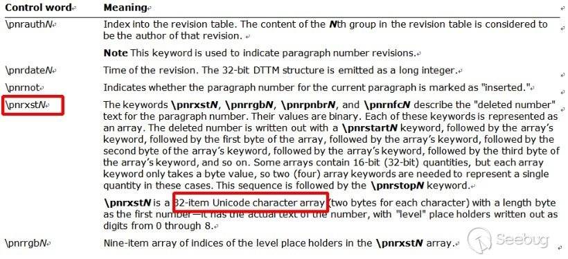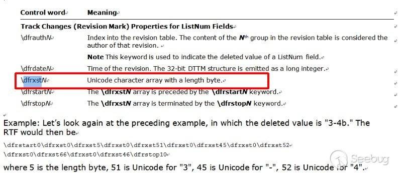 該控制字用于構造RevsionMark相關的字符串,參數為字節。即構造unicode字符串也是以單字節的形式進行的。然而文檔中對控制字 \dfrxst 對應的內部字節數組是多長并未明確指出。詳細查看該部分其它的控制字,我們發現了一個類似的控制字有這樣的描述: