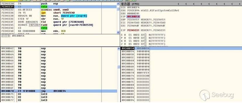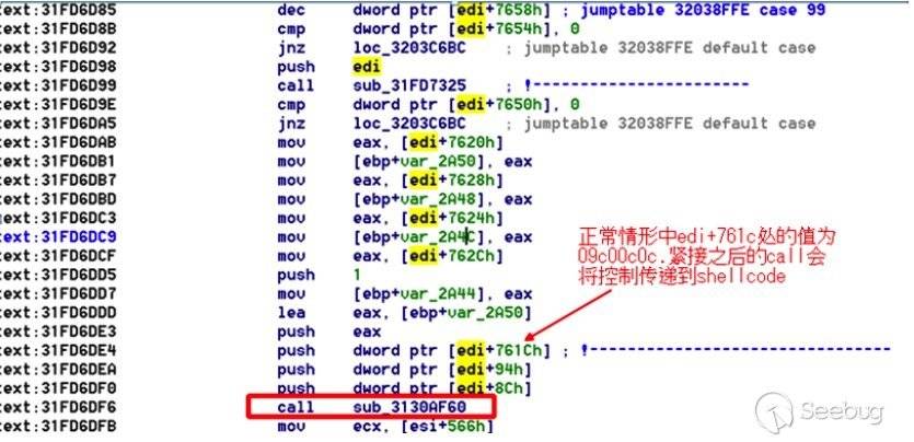 關于這里用到的ROP鏈及shellcode本文最后將單獨說明。這里繼續查找地址edi+0x761c中0x09c00c0c的來源。我們定位到了如下關鍵代碼:
