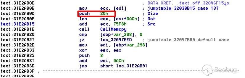 可以看出這個代碼是復制該數組數據的邏輯,從拷貝大小參數來看該數組實際分配的大小為0x20字節。而在為該數組附加字節的邏輯中限制寫成了0x40字節,發生數組越界寫入,進而導致數組之后的類成員變量被改寫。