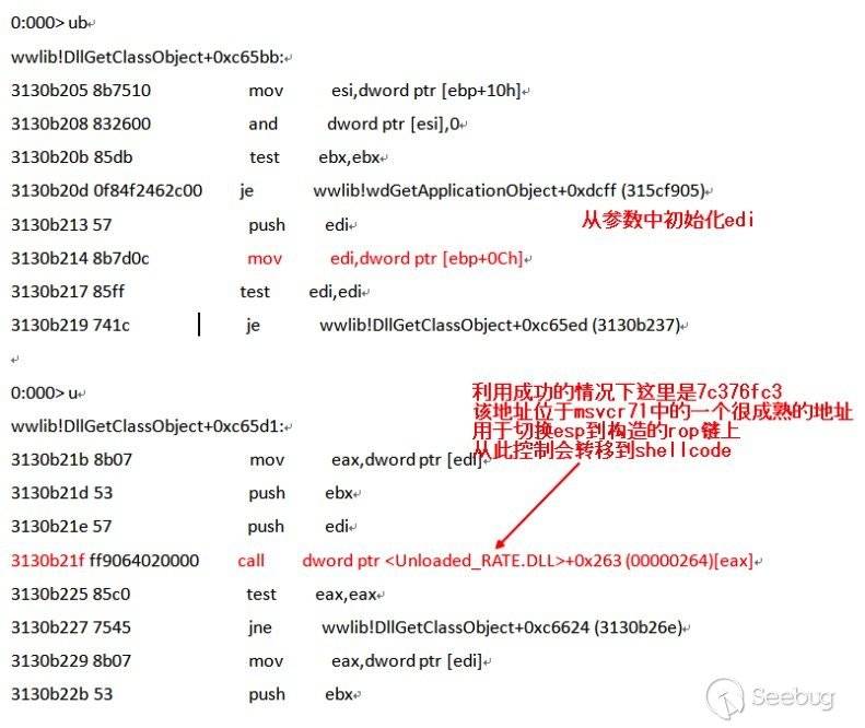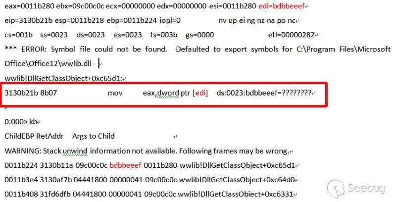 可見崩潰點位于 wwlib.dll 中,而負責 RTF 解析的邏輯正是位于該模塊。通過進一步回溯,edi 的值來源于 [obj_xx+0x761c],相關的調用點如下: