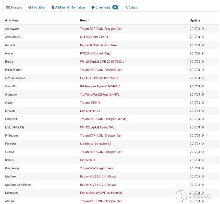 通過對郵件附件樣本進一步分析發現,其利用的漏洞為澳洲國防部計算機應急響應中心提交的CVE-2016-7193。該漏洞為RTF文件解析漏洞,成功利用該漏洞可以遠程執行任意代碼。我們攔截的樣本雙擊打開后會在本地釋放后門程序,從而完全控制目標主機。