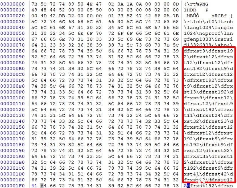 這些附加的字節又從哪里來呢?由于有針對RTF格式混淆技術的運用,現有工具無法滿足提取ole對象的目的,我們人工仔細分析了該RTF文檔發現,該RTF文檔包括如下幾個部分: