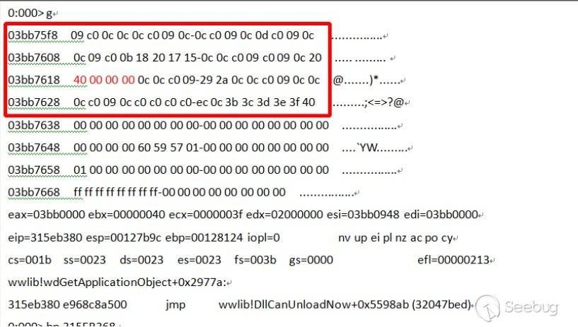 根據此處的描述我們推斷對于\dfrxst,內部分配的字節數組長度為0x20字節。然而在解析該控制字的代碼中,控制數組字節數的常量被認為是0x20(32)個Unicode字符,寫成了 0x20* sizeof(wchar_t),結果為0x40,大于內存分配的長度0x20,結果導致數組越界寫入。 之后進一步的分析我們發現,被0x09c00c0c替換掉的偏移0x761c處的對象與\shp控制字相關。因而該控制字在樣本中是必要的。還有兩個控制字\shpbxignore和\shpbyignore用于操作\shp對應的對象過程中執行流的調整(位于wwlib.31fd6d99處的函數調用中),以避免相關的邏輯執行導致對象數據構造復雜化。當然,這里樣本中這么做取決于作者開發漏洞利用的方法。我們調試發現,控制了\shp對象數據后,還有其它劫持控制流的路徑,本文不再詳述。