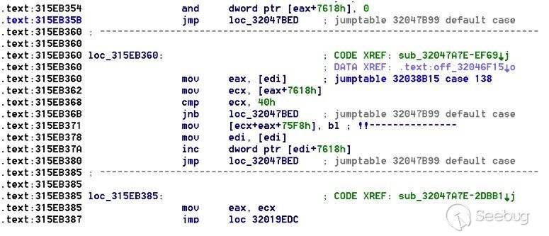 很顯然,關鍵代碼位于一個大的switch結構中。應該是解析某種“bytecode”對應的handler部分。從這段代碼來看,eax+0x75f8開始是一個字節數組(不是數組指針),而位于eax+0x7618處是當前數組元素個數。每解析對應的“bytecode”時,該數組附加一個字節。數組最大長度被限制為0x40字節。按代碼邏輯來看,數組起始于eax+0x75f8,終止于eax+0x7638。而表示數組當前元素個數的變量位于該數組范圍內,即eax+0x7618。