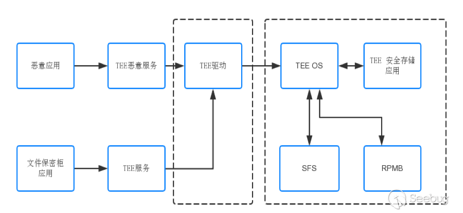 主要的攻擊方法如上圖所示,我們通過構造一個惡意的Tee服務和一個惡意的應用。惡意的應用提供攻擊的操作界面,而惡意的Tee服務利用文件保密柜應用的簽名信息直接和內核的Tee驅動進行通信,從而繞過了合法的Tee服務對文件保密柜應用的驗證。