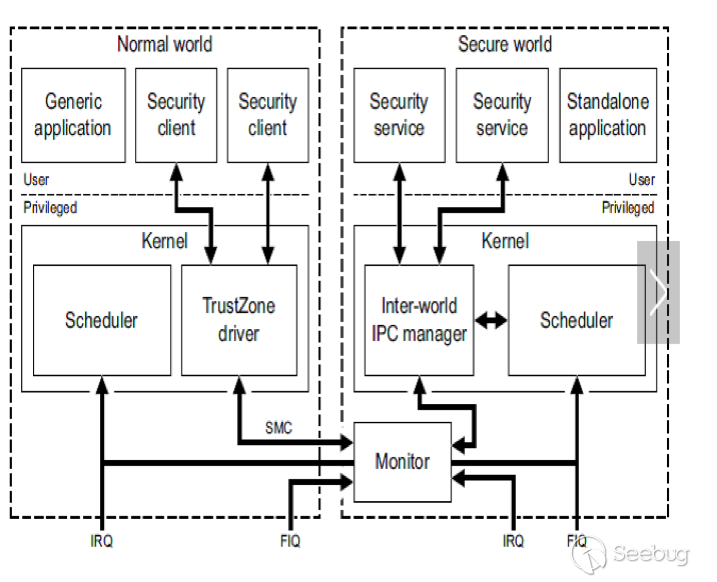 中斷隔離技術:為了區分安全世界和普通世界的中斷源,ARM設計了FIQ和IRQ兩種不同的中斷源,設計者可以將FIQ用于安全世界的中斷源,將IRQ用于普通世界的中斷源。