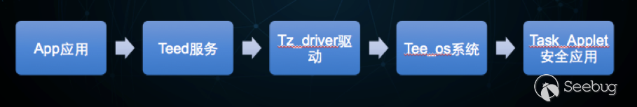 文件柜App應用調用Teed服務,Teed服務調用tz_driver驅動與內核進行通信。tz_driver驅動通過smc指令切換到TrustZone執行環境, TrustZone根據應用Id,調用具體的TA(Tee applet)完成加密密鑰的存儲和讀取。