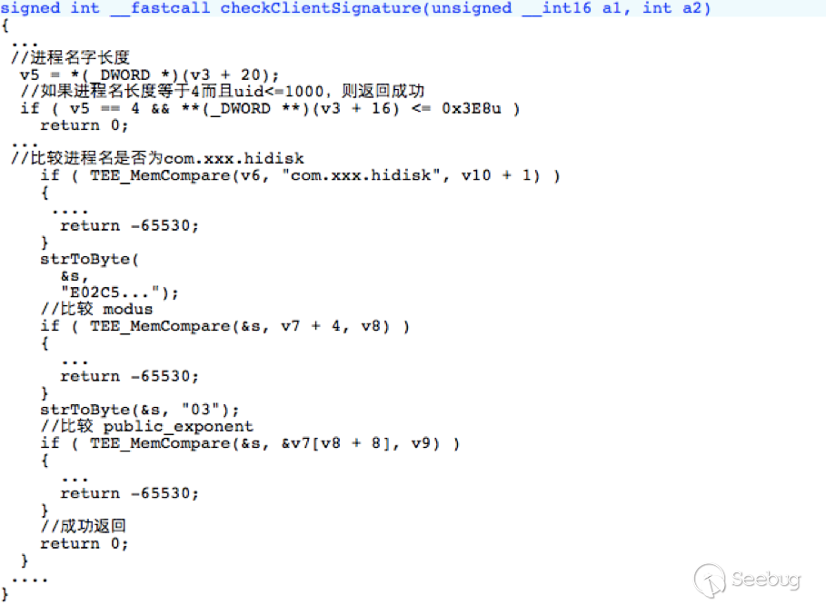 (1)如果應用進程的uid<=1000且進程名的長度為4時,checkClientSignature返回驗證成功。如果攻擊者安裝一個名字長度為4的惡意程序(如abcd),并且以system用戶的權限運行該程序,通過該程序調用TrustZone中的安全存儲應用,則可以讀取明文的文件加密密碼。