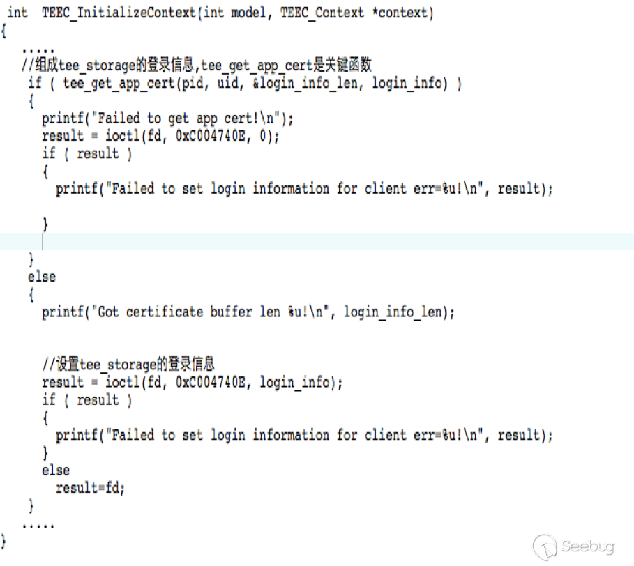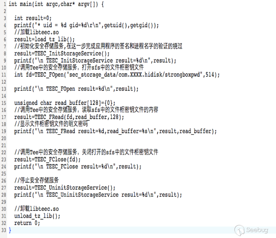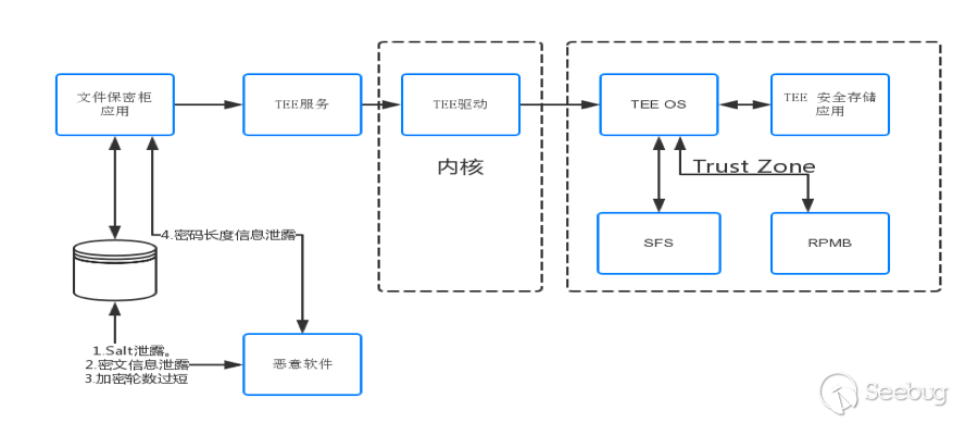 TrustZone中的安全存儲應用對文件保密柜應用的驗證存在漏洞,攻擊者可以繞過這些驗證,調用TrustZone中的安全存儲應用,獲得解密后的密鑰。