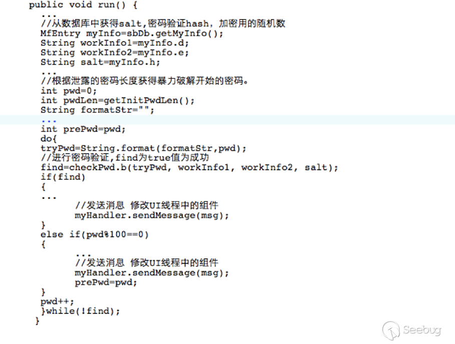 主要的攻擊方法如上圖所示。我們通過在手機上安裝一個惡意編寫的軟件,通過該軟件讀取文件保密柜應用泄露的密碼長度,同時通過讀取文件保密柜應用數據庫中的Salt,用于密碼比對的Hash值。利用這些值我們可以快速地進行暴力破解文件保密柜中的密碼。
