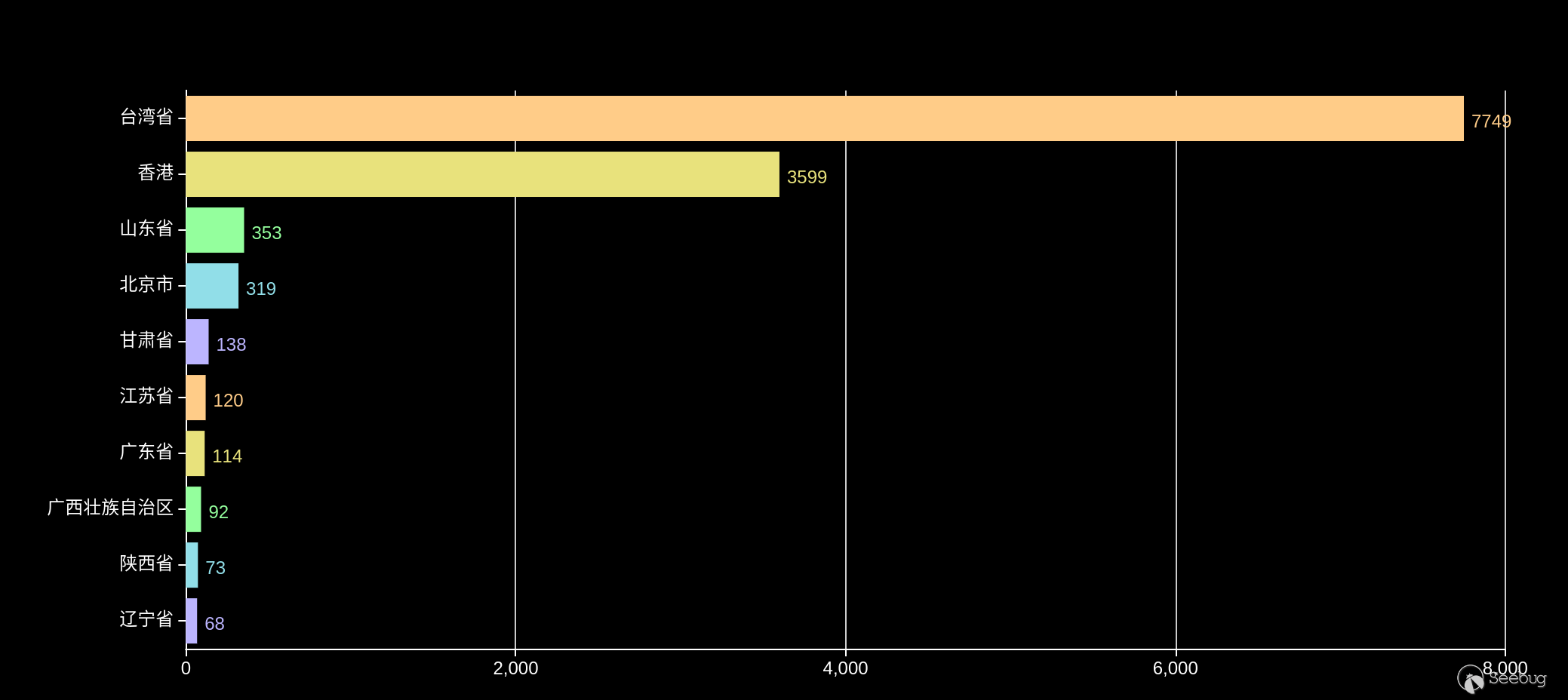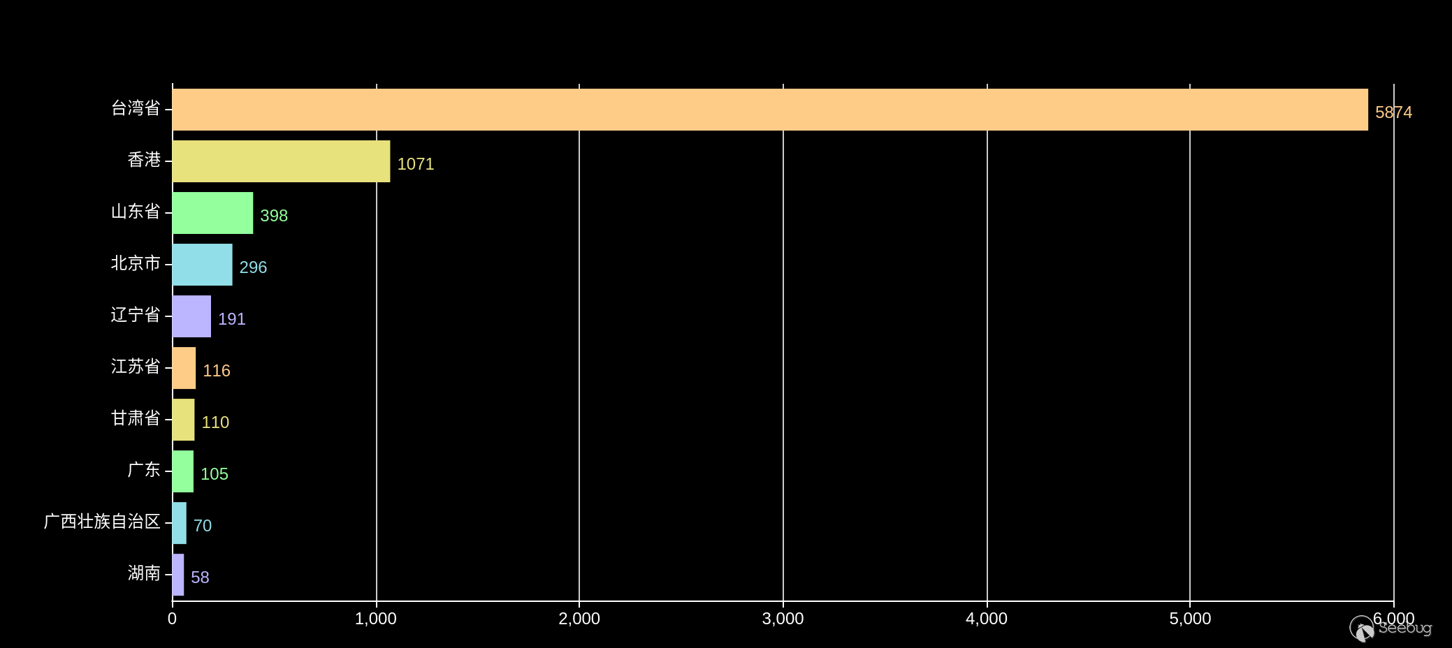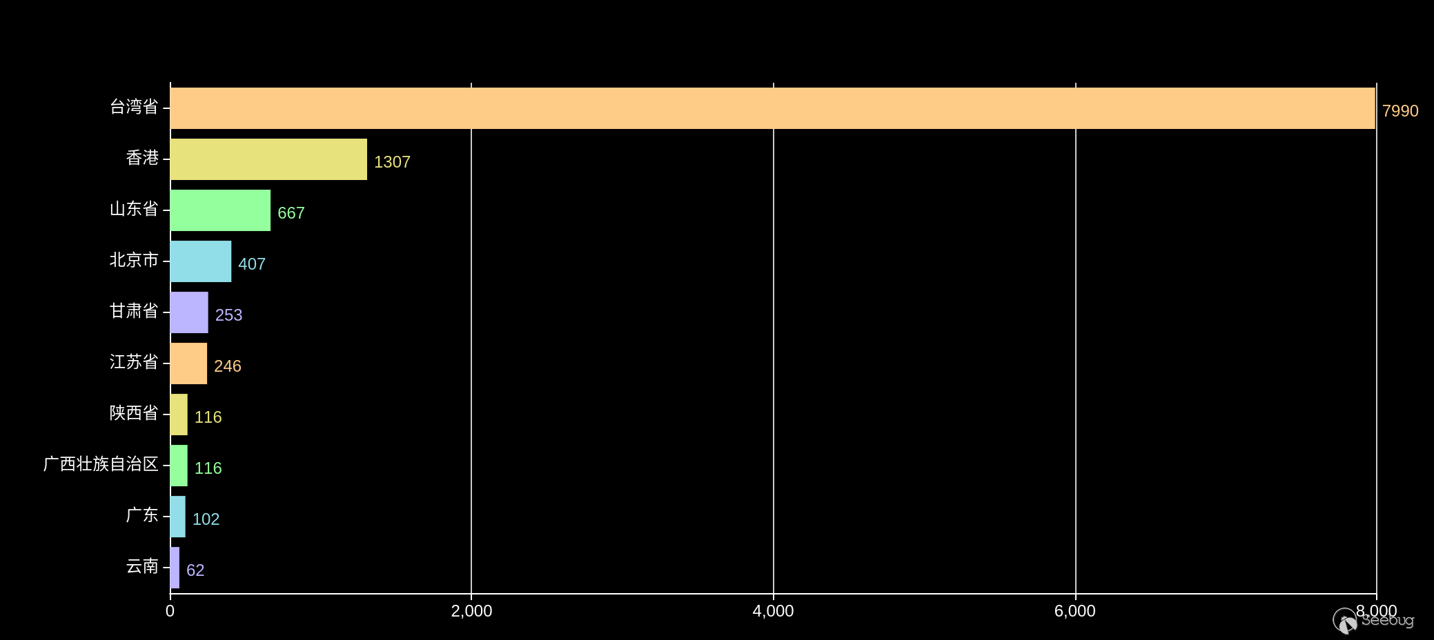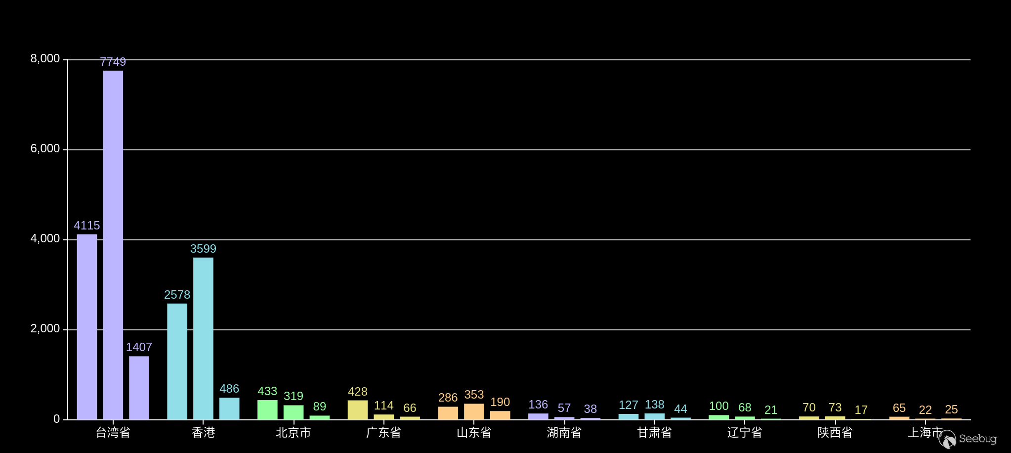 我國各省市被植入 Doublepulsar 后門的設備數量對比: