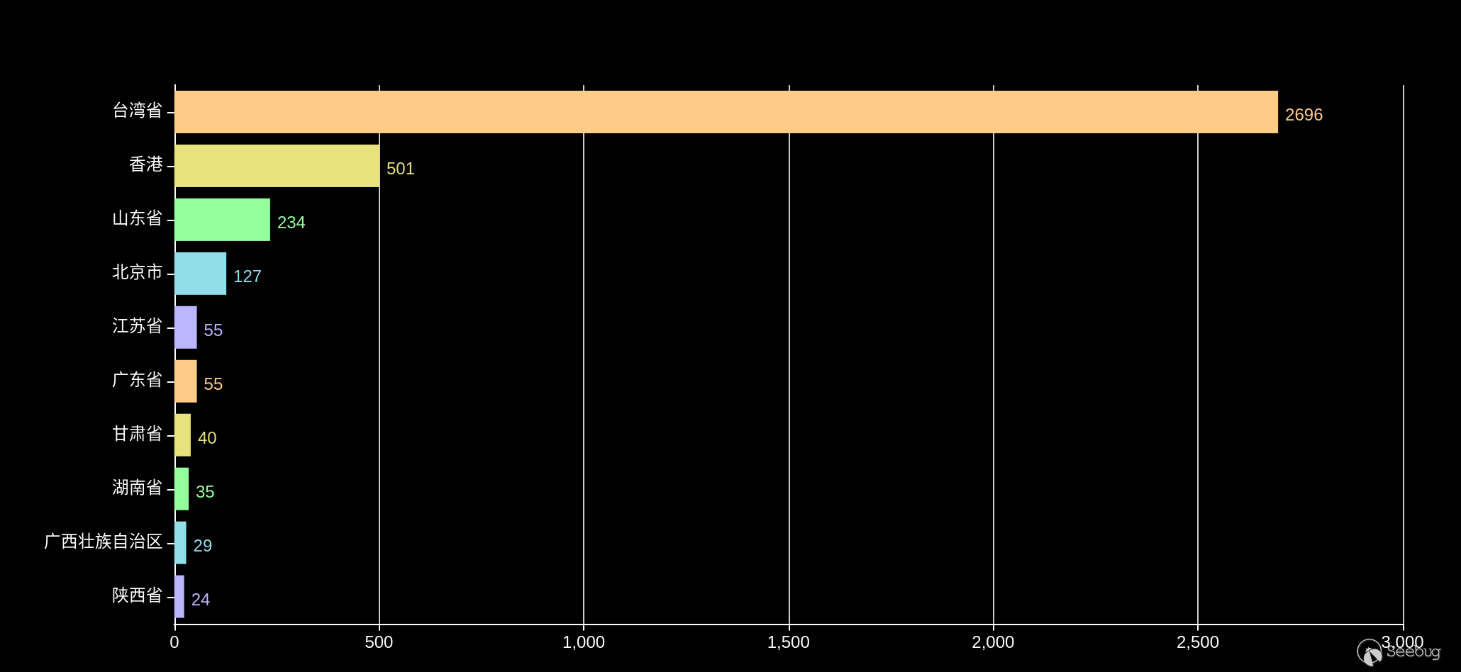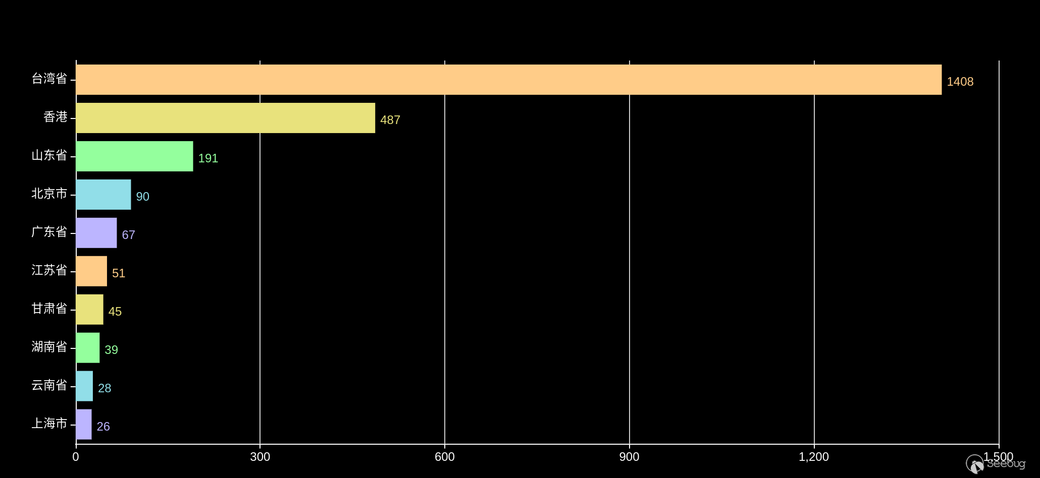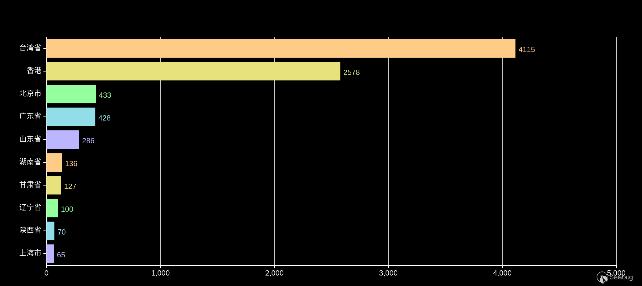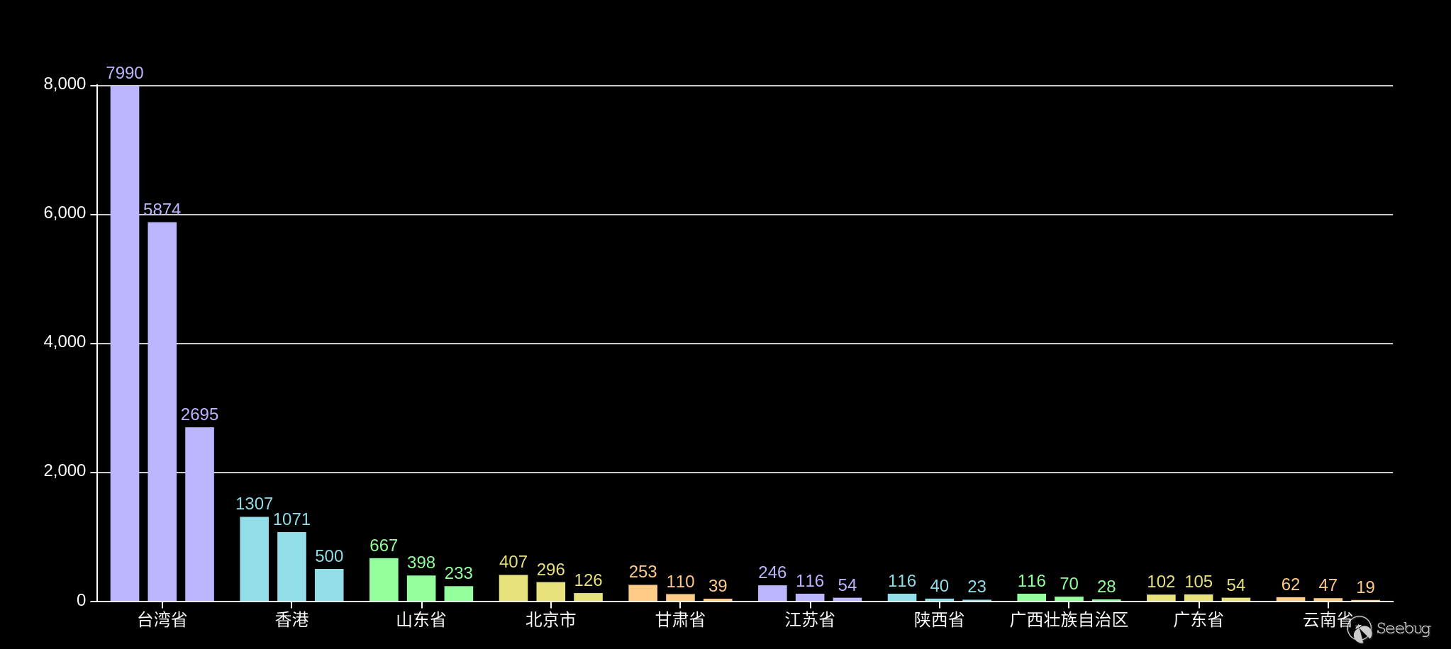 我國各省市被植入 Doublepulsar 后門的設備數量對比: