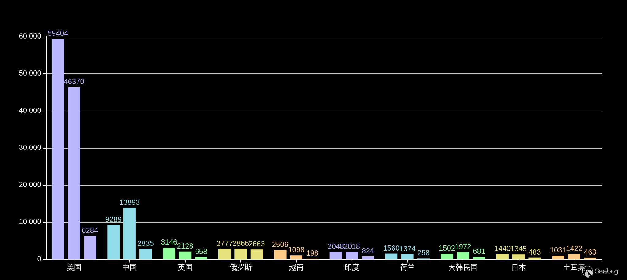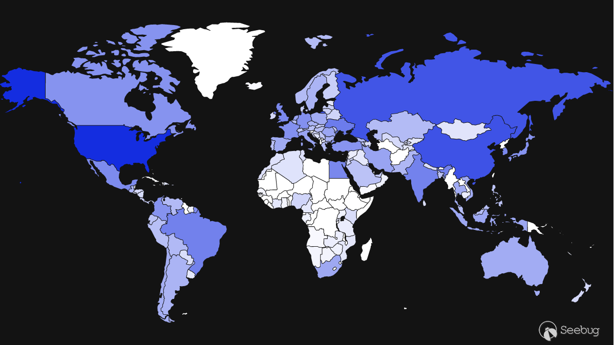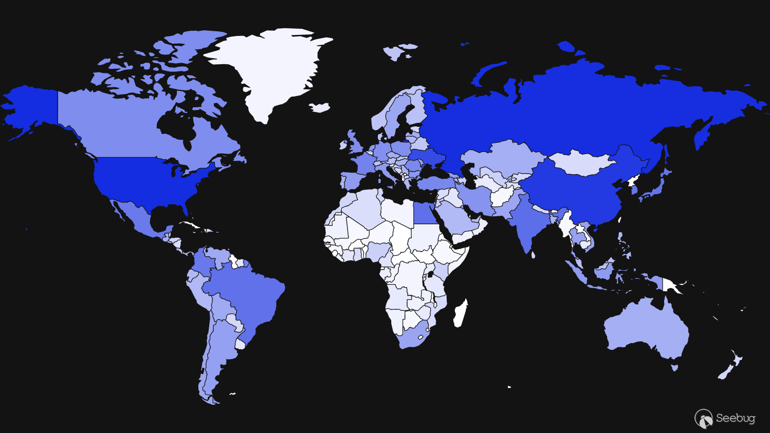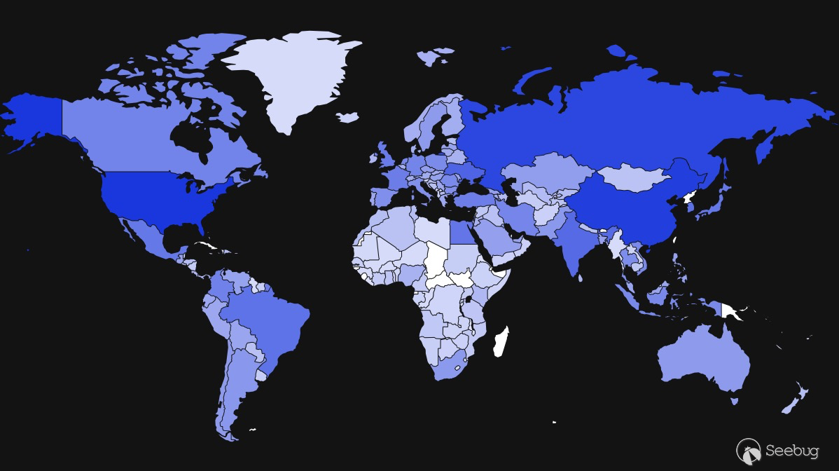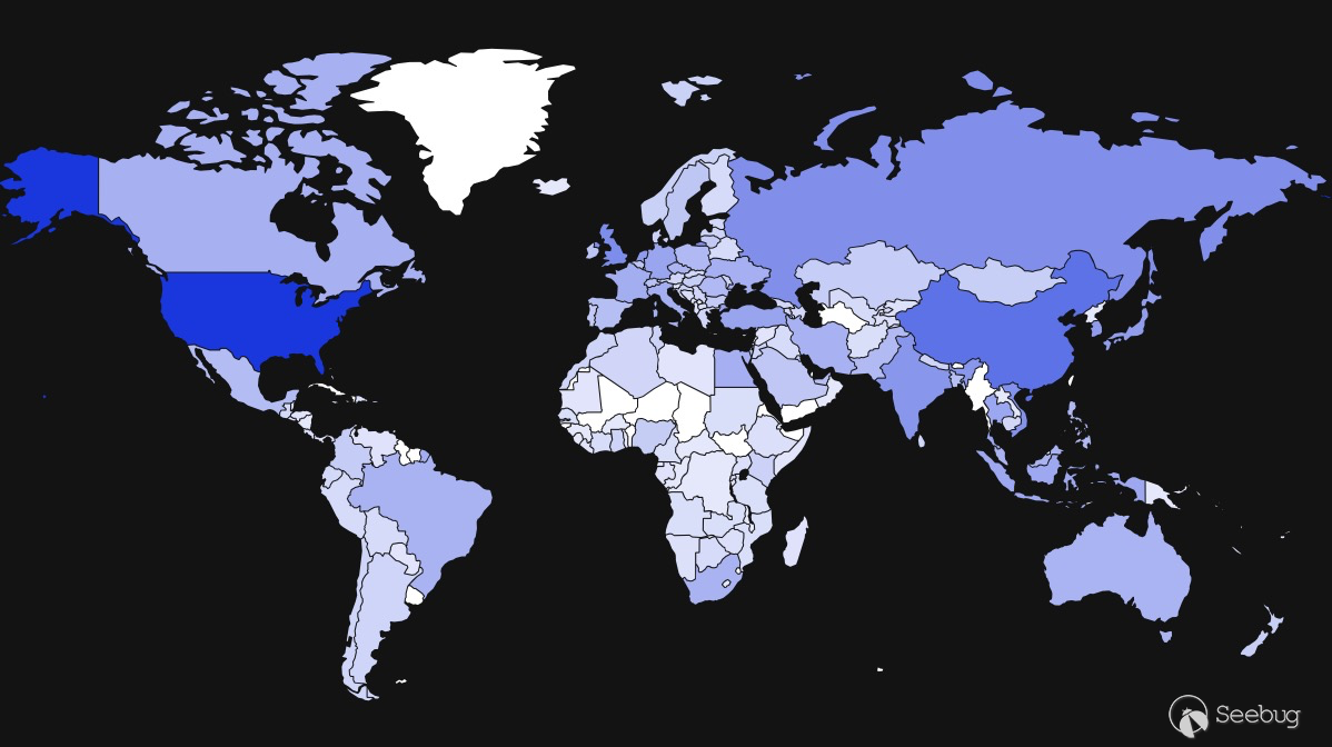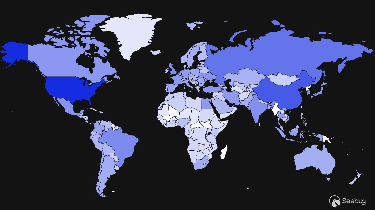 2017 年 5 月 2 日,第二輪針對 Doublepulsar 后門植入情況的探測結束,全球共有 107,163 臺設備被植入后門,其國家分布如下: