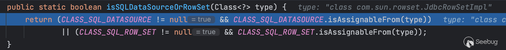 在上一節中說道,Fastjson2在解析字符串時,可以通過使用 Lxxx; 的形式繞過他的黑名單限制,但是除了對于類名的判斷,Fastjson2還有一些其他的黑名單檢測方式,比如在 checkAutoType 時判斷了一個類是否為 DataSource 相關的類。