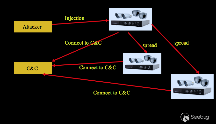 本次發現的Amnesia僵尸網絡運行在PowerPC架構上,首先攻擊者通過暴力猜解或者其他手段感染DVR設備,使Amnesia惡意代碼在DVR上開始運行,當Amnesia運行后,它會連接遠程C&C,并根據控制指令中指定的IP范圍掃描網絡中的其他DVR設備進行傳播。