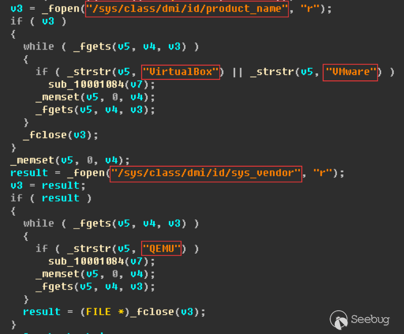 Linux系統中的/sys/class/dmi/id目錄里存放了主機的相關硬件信息,包括產品信息、主板信息、Bios信息等,Amnesia就是通過讀取該目錄中的文件獲取當前主機的硬件信息。當Amnesia運行時會讀取/sys/class/dmi/id/product_name和/sys/class/dmi/id/sys_vendor文件,并匹配其中是否包含關鍵字“VirtualBox”、“VMware”和“QEMU”來判斷當前目標系統是否為虛擬機。