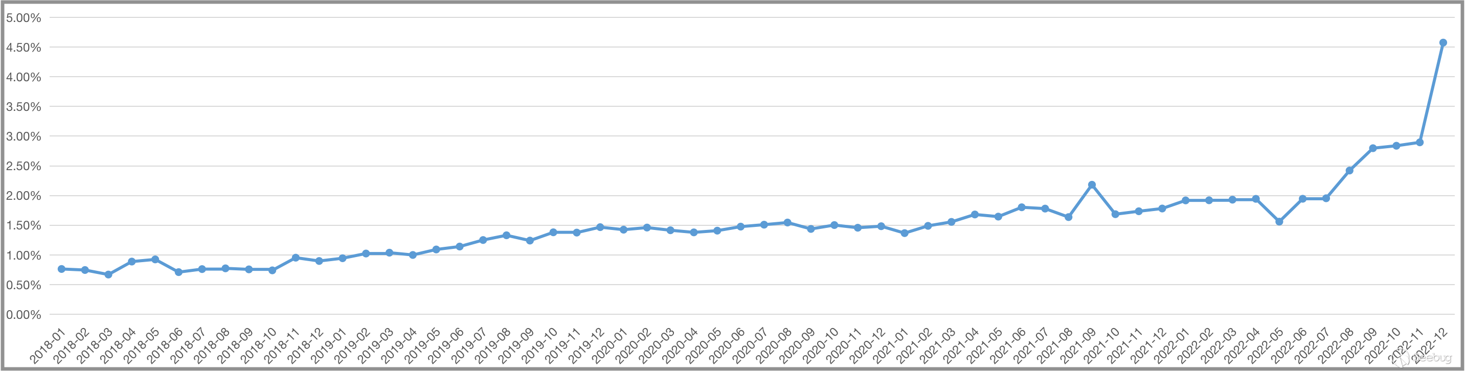 我們通過觀察變化趨勢發現:2018年期間,印度在線IP數量占全球的比例均低于1%;2019年至2022年上半年,該比例位于1%和2%之間;2022年下半年,該比例均高于2%。這個持續上升趨勢,顯著的反映出印度互聯網發展水平的持續增長。