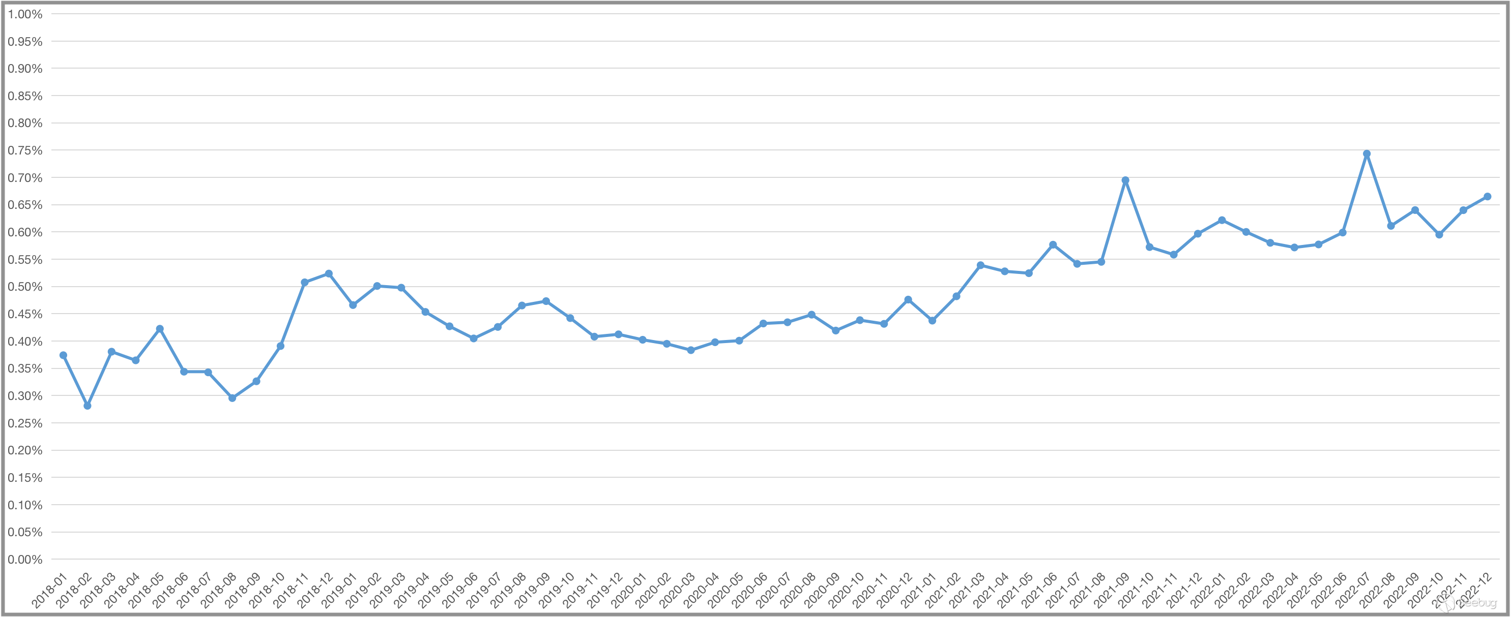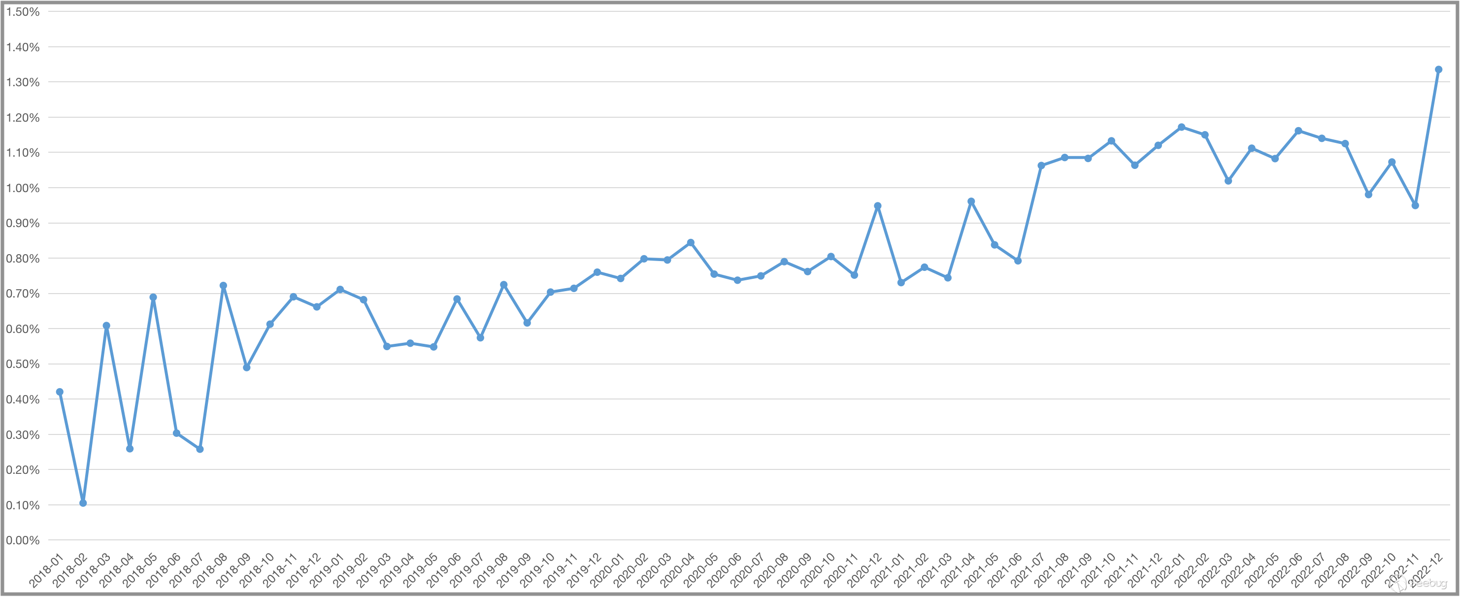 By observing the trend, we find that during 2018, the proportion of online IP counts for India remained below 1%. From 2019 to the first half of 2022, it ranged from 1% to 2%. In the second half of 2022, it consistently exceeded 2%. This continuous upward trend significantly reflects the sustained growth of internet development in India.