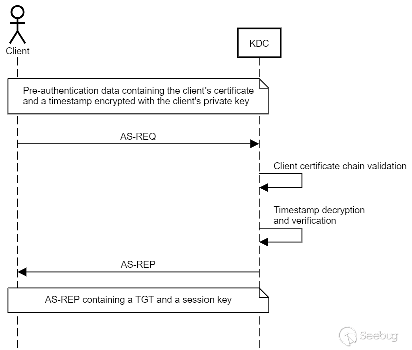 該方法允許 KDC 和客戶端安全地建立共享會話密鑰,即使攻擊者擁有客戶端或 KDC 的私鑰。會話密鑰將存儲在 TGT 的加密部分,它是用 Krbtgt 帳戶的密鑰(哈希)加密的。