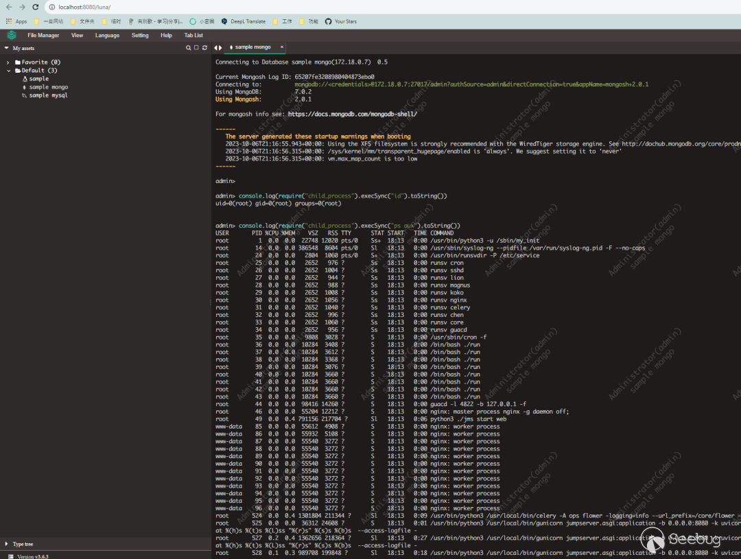 復現方法是,在Jumpserver后臺增加MongoDB資產并來到Web Terminal模塊連接數據庫,即可在交互式命令行中執行JavaScript代碼: