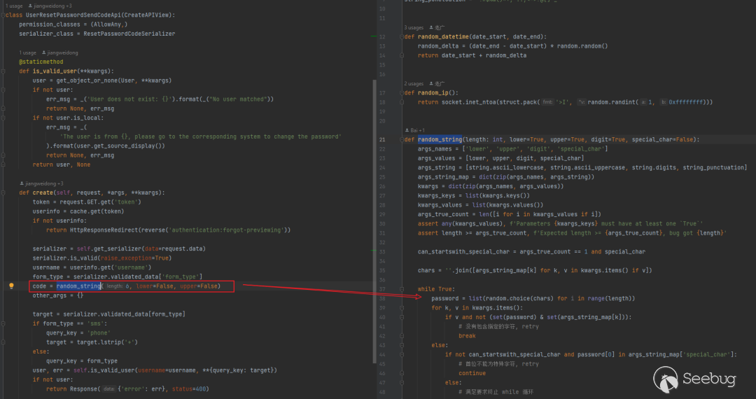 那么答案就呼之欲出了,使用第三方模塊django-simple-captcha提供的方式獲取固定在進程中的偽隨機數種子,然后馬上請求UserResetPasswordSendCodeApi生成找回密碼使用的code,通過預測這個code修改目標用戶密碼。