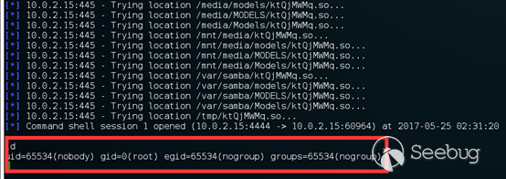 滿足以上條件時,由于 Samba 能夠為選定的目錄創建網絡共享,當惡意的客戶端連接上一個可寫的共享目錄時,通過上傳惡意的共享庫文件,觸發漏洞使 Samba 服務端加載并執行它,從而實現了遠程代碼執行。根據服務器的配置情況,惡意代碼還有可能以 root 權限執行。
