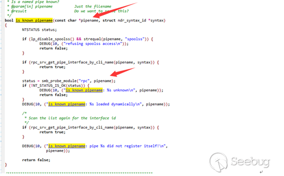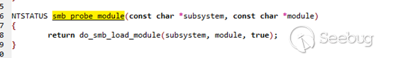 在這里可以看到 pipename ,這個是管道名,需要利用這個管道名是惡意共享庫so文件參數,比如/tmp/xxx.so , 這個參數在傳遞進 smb_probe_module 里,跟進下這個函數: