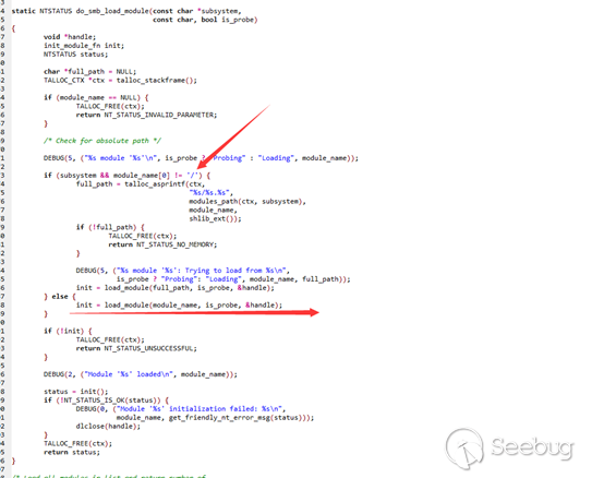 可以看到如果管道名字存在/, 會進入else 里調用load_module()函數,把管道名傳遞進來,再繼續跟進: