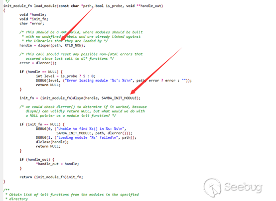 可以看到把管道名傳遞進入到 dlopen 函數也就是打開惡意構造的共享庫文件,接著把句柄給了 dlsym 加載SAMBA\_INIT\_MODULE,也就是說惡意共享庫的功能要寫入到 Samba 初始化函數里才能被加載,這樣就觸發了惡意構造的函數功能呢。