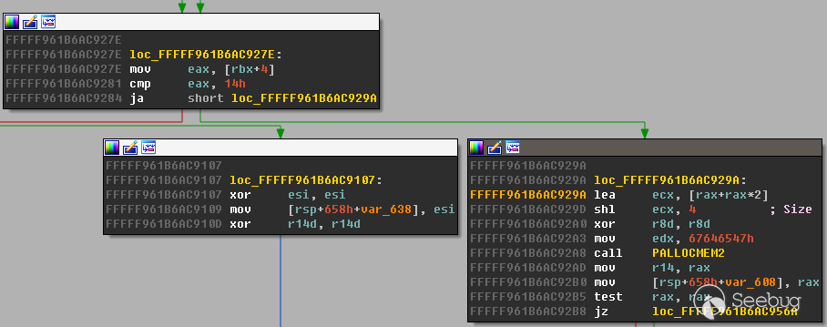 如果 eax > 0x14 就會執行 lea ecx, [rax+rax*2]; shl ecx, 4 ,這里就可能導致整數溢出使之后