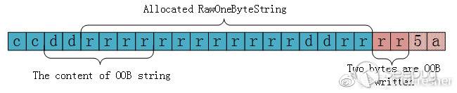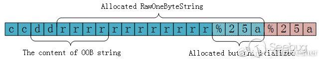 c)下圖為在執行了代碼片段3的第二步后的內存狀態,r 代表隨機值。分配的 RawOneByteString 為16字節,包括12字節的頭部和4字節的解碼后的字符(因為第一次訪問越界字符串時內容為 "dd%a" ,所以計算的解碼后的字符串應該是 "dd%a" ,為四個字節)