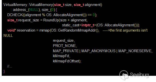 第二種思路是越界寫時寫過 New Space 的邊界,改寫非 New Space 內存的數據。這需要跟在 New Space 后的內存區間是被映射的內存并且是可寫的。New Space 的內存范圍是不連續的,它的基本塊的大小為1MB,最大可以達到16MB,所以越界寫時可以選擇寫過任意一個基本塊的邊界。我們需要通過地址空間布局將我們需要被覆蓋的內容被映射到一個 New Space 基本塊之后。將一個 Large Space[7] 的基本塊映射到 NewSpace 基本塊之后是一個比較好的選擇,這樣可以能覆蓋 Large Space 中的堆對象。不過這里有個障礙,我們應該記得,當第一個參數為 NULL 時,mmap 映射內存是總是返回 mm->mmap_base 到 TASK_SIZE 之間能夠滿足映射大小范圍的最高地址,也就是說一般多次 mmap 時返回的地址應該是連續的,這樣的特性很有利于操縱內存空間布局,但很不幸的是,chrome 在分配堆的基本塊時,第一個參數給的是隨機值,如下代碼所示[9]: