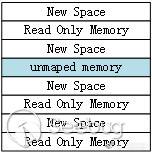 即每一個 New Space 的基本塊后都映射了一個只讀的內存空間,這樣無論怎樣進行地址空間布局都不能在 New Space 之后映射 Large Space ,我們采用了 web worker 來避免產生這種狀態,因為 web worker 是一個單獨的 JS 實例,每一個 web worker 的 New Space 的地址空間都不一樣,如果當前 web worker 處于上圖所示狀態,我們將結束此次利用,重新啟動一個新的 webworker 來進行利用,期望新的 web worker 內存布局處于以下狀態,至少有一個 New Space 基本塊之后是沒有映射的內存地址空間: