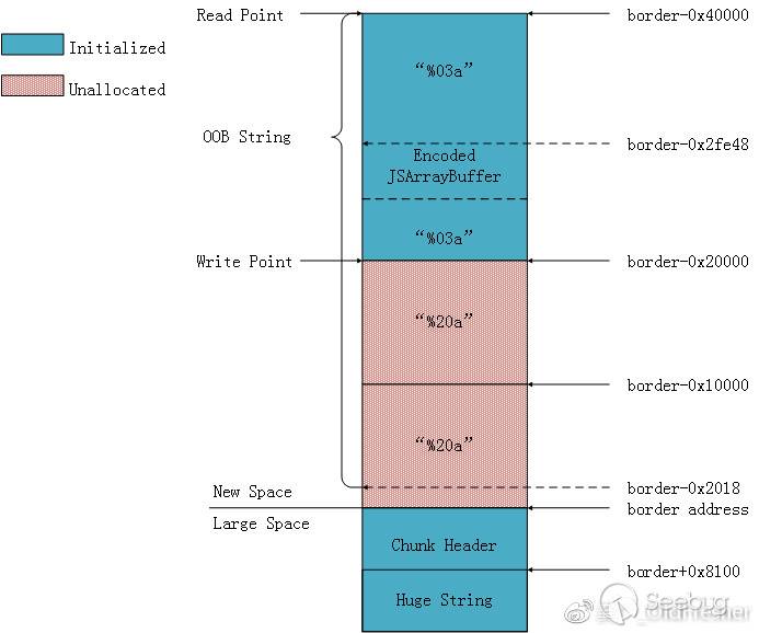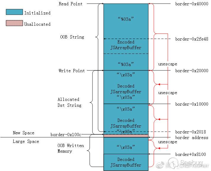 假設 Large Space 基本塊的起始地址為 border address,border address 之上是 New Space ,之下是 Large Space , 需要被覆蓋的超長字符串對象位于 border+0x8100 位置,我們構造一個越界串,它的起始地址為 border-0x40000 ,結束地址為 border-0x2018 ,其中 border-0x40000 到 border-0x20000 范圍是已分配并已初始化的內存,存儲了編碼后的 JSArrayBuffer 對象和輔助填充數據 “a”, border-0x20000 到 border-0x2018 是未分配內存,存取的數據為堆噴后的殘留數據 “a”, 整個越界串的內容都是以 “%xxy” 的形式存在,y不是字符%,整個越界串的長度為 (0x40000-0x2018),所以 unescape 代碼片段3中第一步計算出的目的字符串的長度為 (0x40000-0x2018)/2 ,起始地址為 border-0x20000 ,執行完 unescape 后的內存示意圖如下: