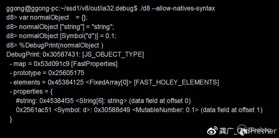 在 V8 引擎中,除公有屬性外,還有一些特殊的 JavaScript 對象存在一些特殊的屬性,這些屬性只有引擎可以訪問,對于用戶 JavaScript 則是不可見的,我將這種屬性稱作私有屬性。在 V8 引擎中,符號(Symbol)也包括兩種,公有符號和私有符號,公有符號是用戶 JavaScript 可以創建和使用的,私有符號則只有引擎可以創建,僅供引擎內部使用。私有屬性通常使用私有符號作為鍵,因為用戶 JavaScript 不能得到私有符號,所有也不能以私有符號為鍵訪問私有屬性。既然私有屬性是隱形的,那如何才能觀察到私有屬性呢?d8 是 V8 引擎的 Shell 程序,通過 d8 調用運行時函數 DebugPrint 可以查看一個對象的所有屬性。比如我們可以通過如下方法查看代碼1中定義的對 normalObject 的所有屬性: