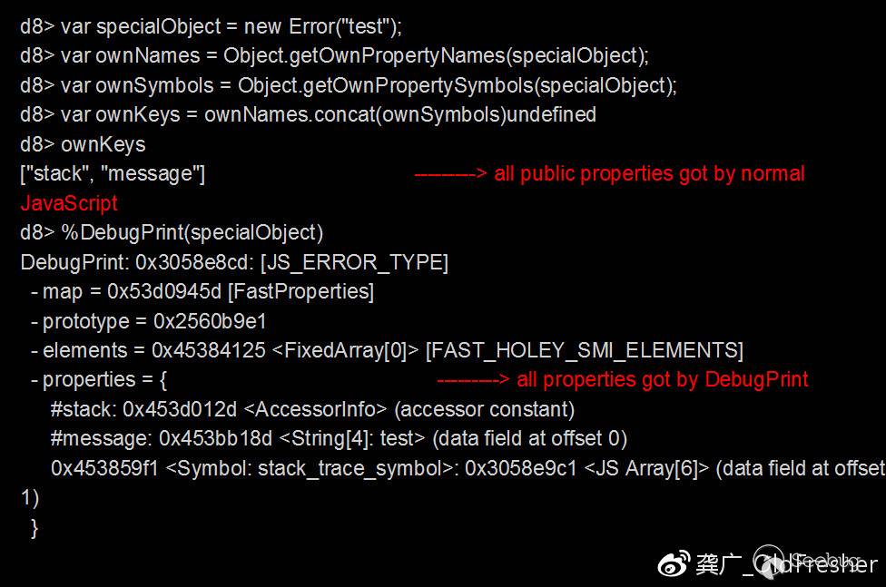 對比一下 specialObject 對象的公有屬性和所有屬性可以發現所有屬性比公有屬性多出了一個鍵為 stack_trace_symbol 的屬性,這個屬性就是 specialObject 的一個私有屬性。下一節將介紹與私有屬性有關的一個 v8 引擎的邏輯錯誤。