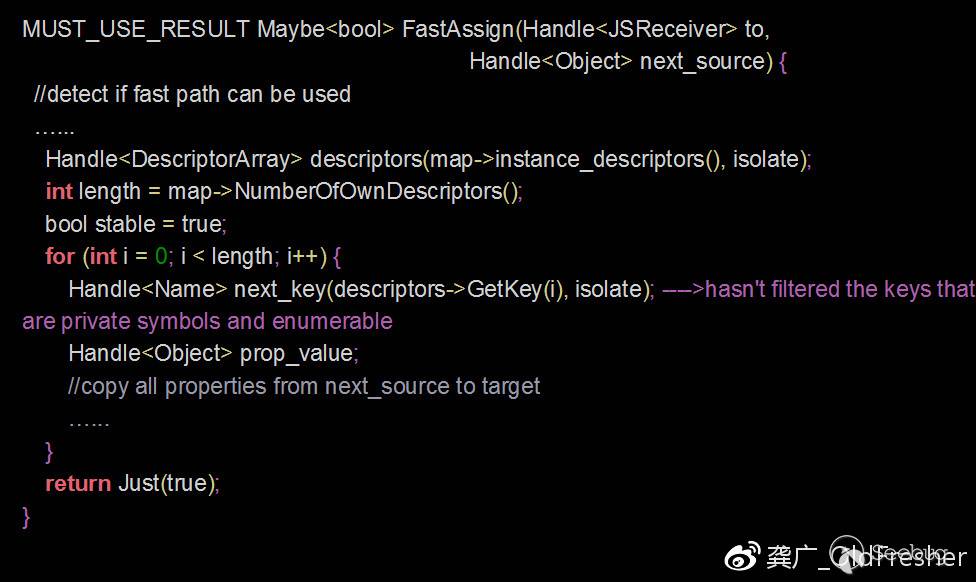 那么問題來了,私有屬性是 v8 引擎內部使用的屬性,其他 JavaScript 引擎可能根本就不存在私有屬性,私有屬性是否應該是可枚舉的,私有屬性應不應該在賦值時被拷貝,ECMAScript 根本就沒有做規定。我猜 v8 的開發人員在實現 Object.assign 時也沒有很周密的考慮過這個問題。私有屬性是供 v8 引擎內部使用的屬性,一個對象的私有屬性不應該能被賦給另一個對象,否則會導致私有屬性的值被用戶 JavaScript 修改。v8 是一個高性能的 JavaScript 引擎,為了追求高性能, 很多函數的實現都有兩個通道,一個快速通道和一個慢速通道,當一定的條件被滿足時,v8 引擎會采用快速通道以提高性能,因為使用快速通道出現漏洞的情況有不少先例,如 CVE-2015-6764[2]、 CVE-2016-1646 都是因為走快速通道而出現的問題。同樣,在實現 Object.assign 時,v8 也對其實現了快速通道,如下代碼所示[3]: